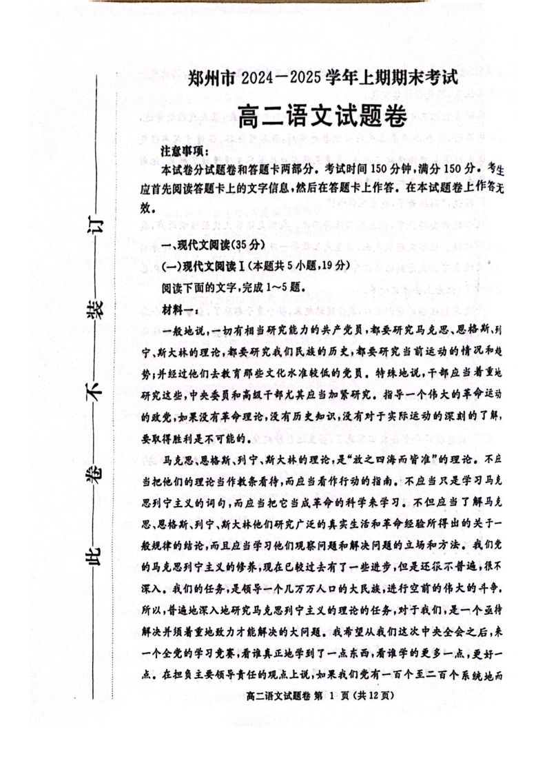 河南省郑州市2024-2025学年上学期1月高二期末考试语文+答案