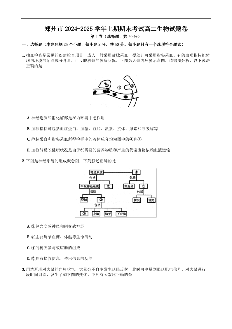 河南省郑州市2024-2025学年上学期1月高二期末考试生物+答案