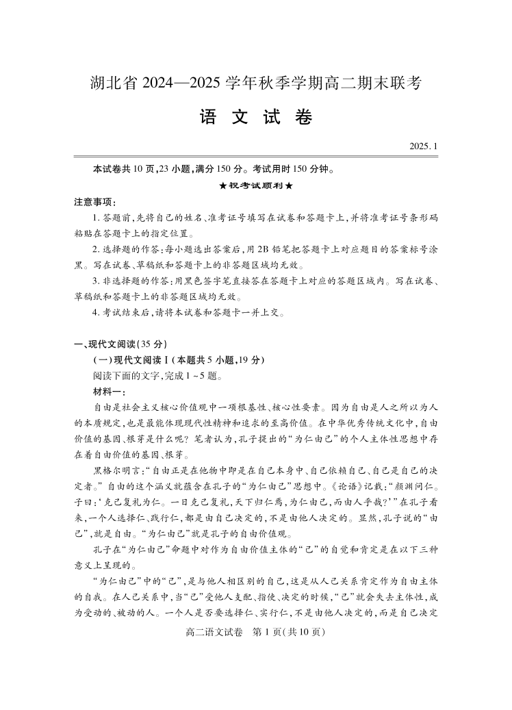 湖北省区域高中2024-2025学年上学期1月高二期末考试语文