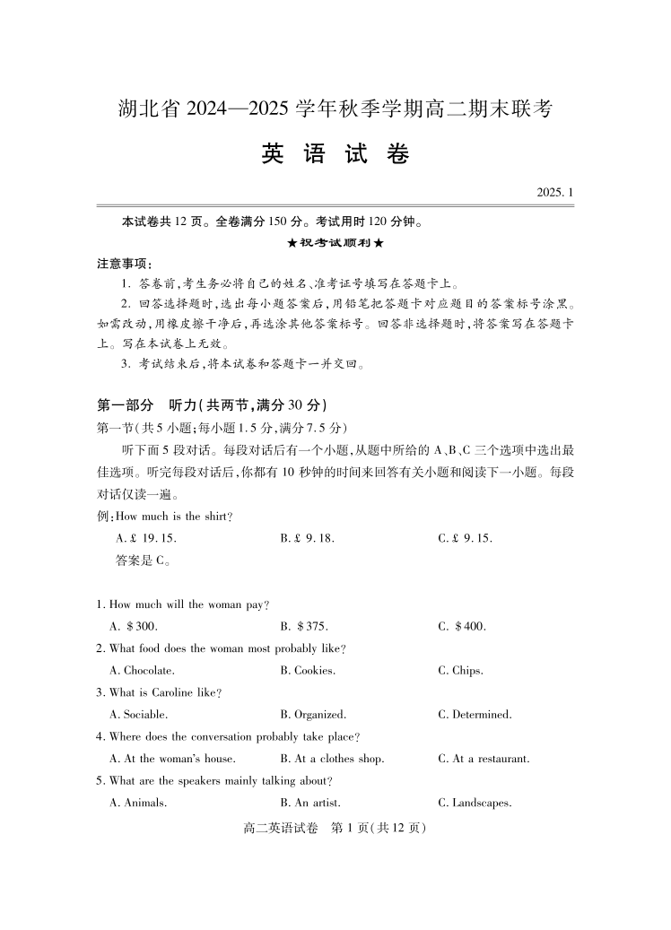 湖北省区域高中2024-2025学年上学期1月高二期末考试英语