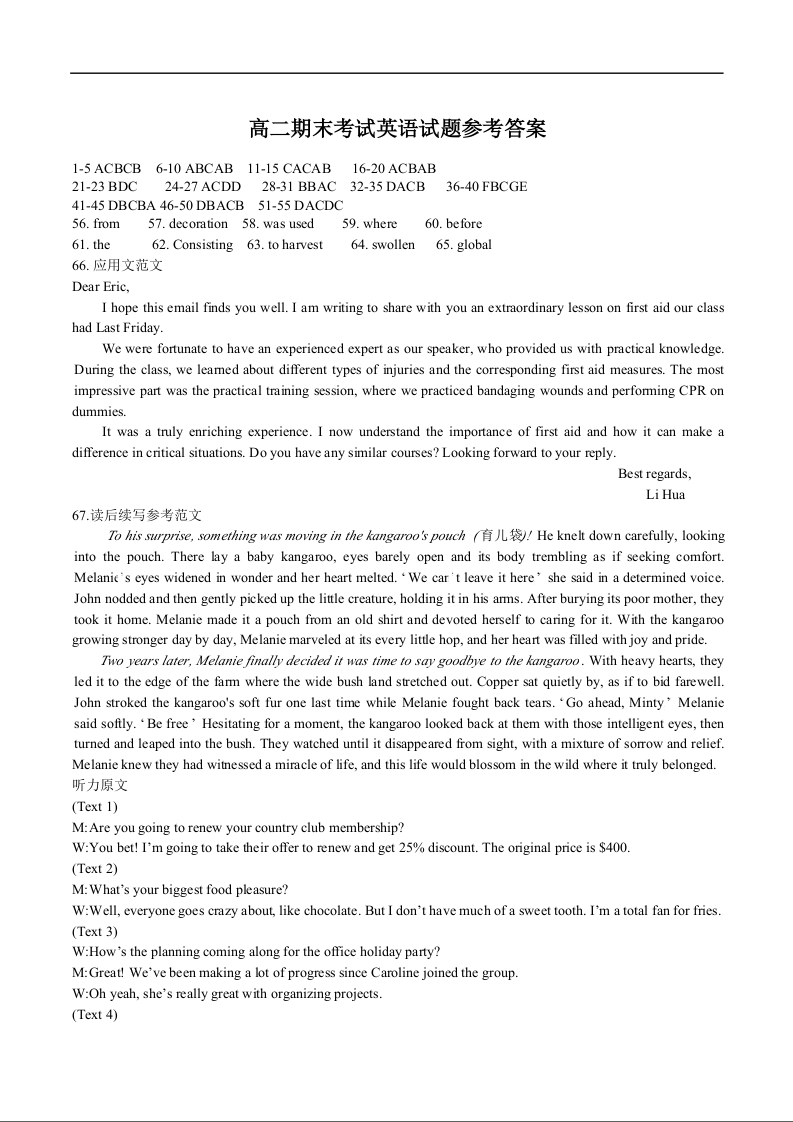 湖北省区域高中2024-2025学年上学期1月高二期末考试英语答案