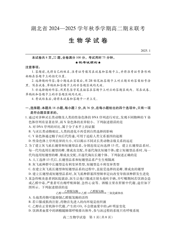 湖北省区域高中2024-2025学年上学期1月高二期末考试生物