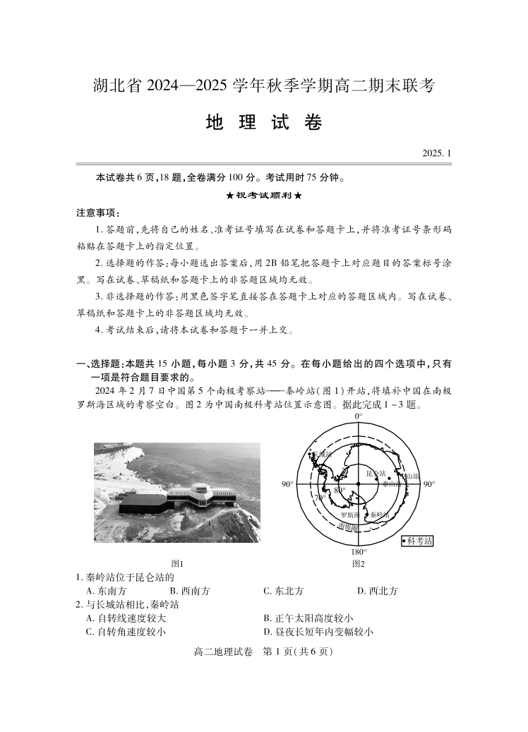 湖北省区域高中2024-2025学年上学期1月高二期末考试地理