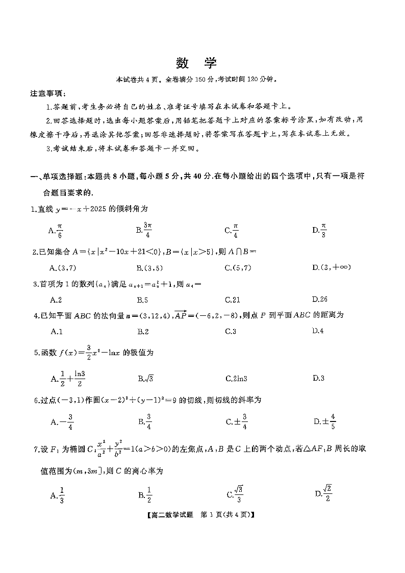 湖南省怀化市2024-2025学年上学期1月高二期末质量检测数学+答案