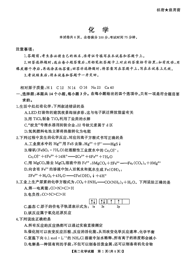 湖南省怀化市2024-2025学年上学期1月高二期末质量检测化学+答案