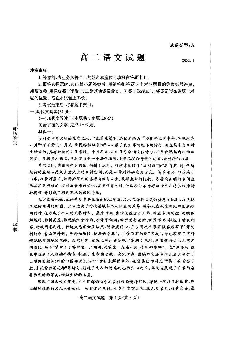 山东省滨州市2024-2025学年上学期1月高二期末考试语文+答案