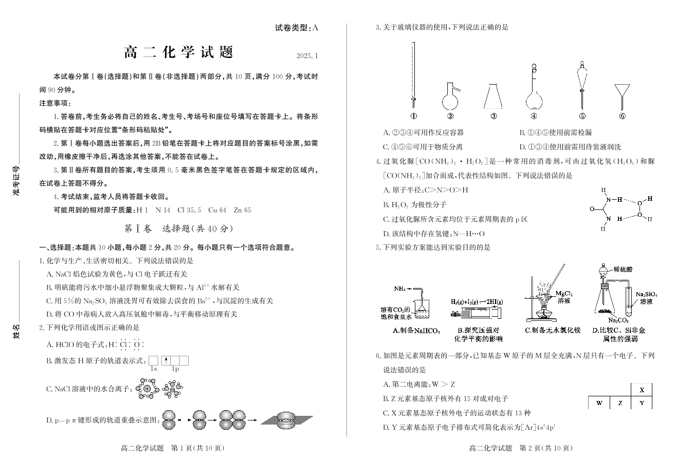 山东省滨州市2024-2025学年上学期1月高二期末考试化学+答案