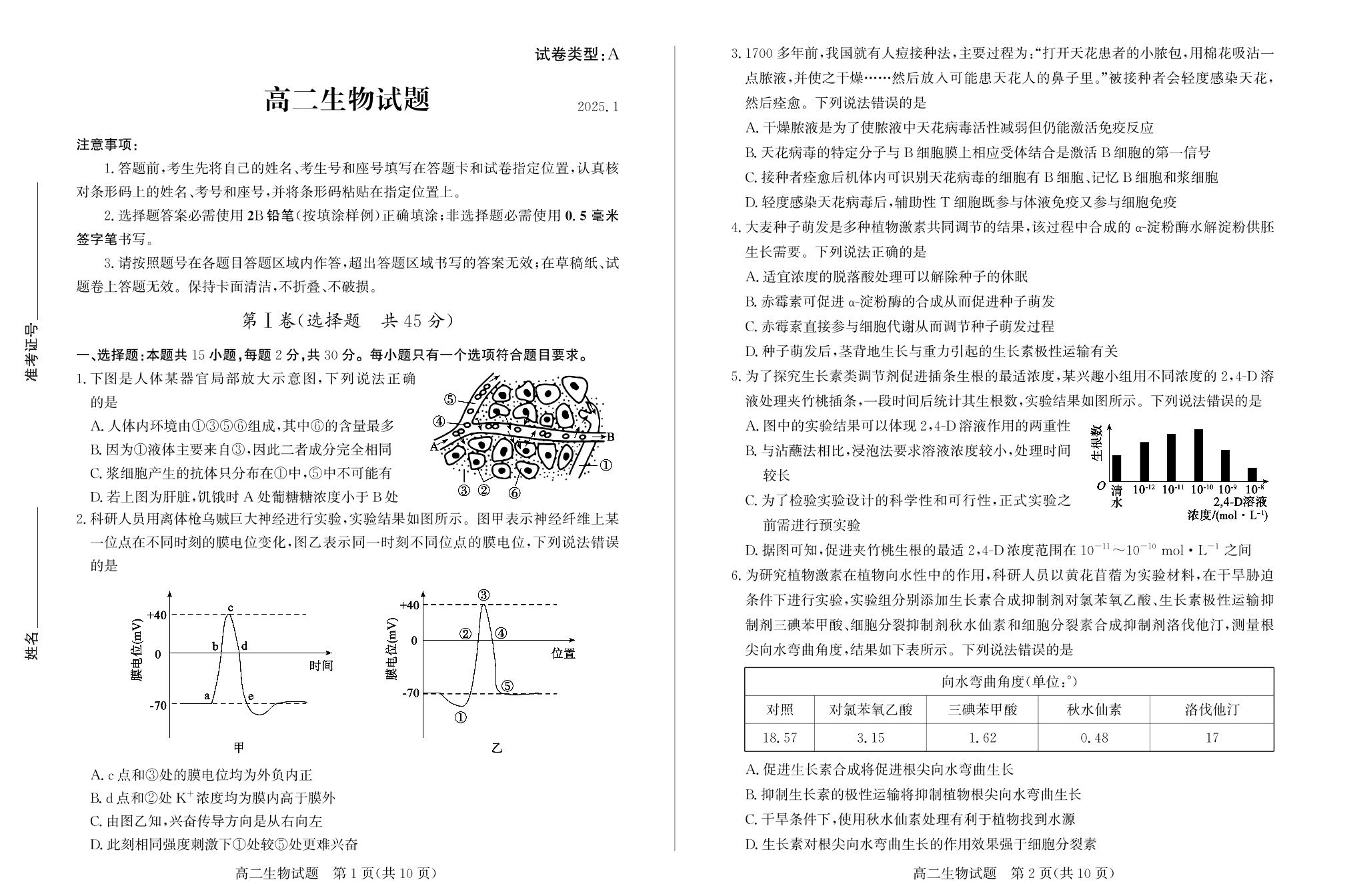 山东省滨州市2024-2025学年上学期1月高二期末考试生物+答案
