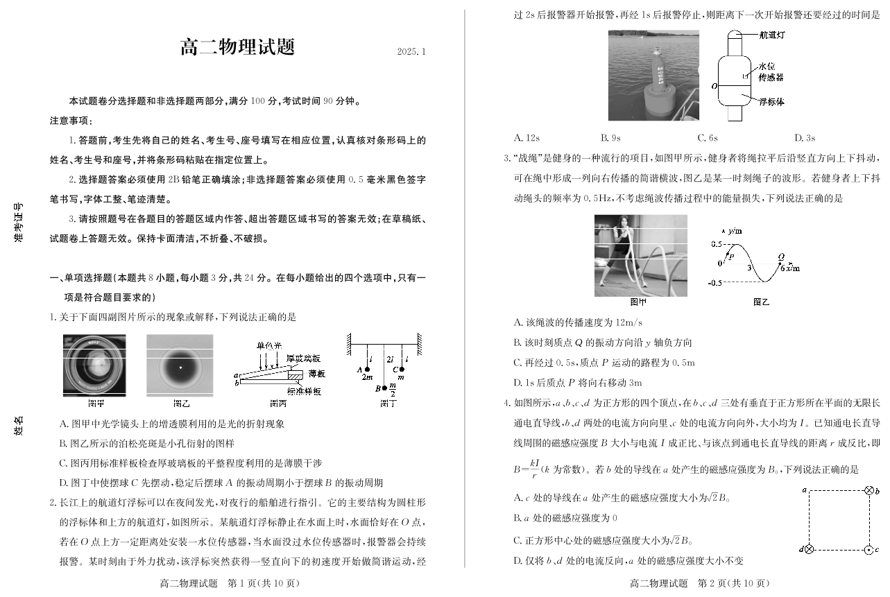 山东省德州市2024-2025学年上学期1月高二期末联考物理+答案