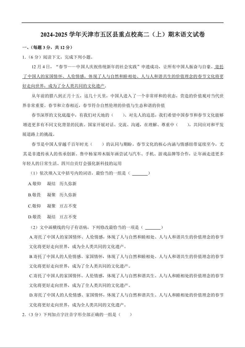天津市五区县重点校2024-2025学年上学期1月高二期末联考语文+答案