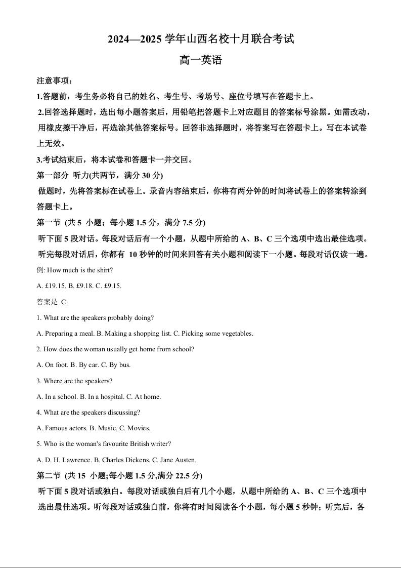 山西省2024—2025学年山西名校十月联合考试英语+答案