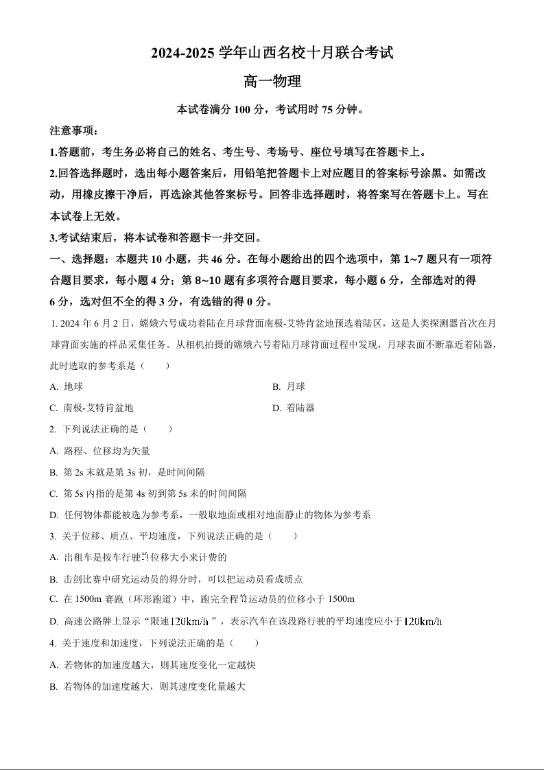 山西省2024—2025学年山西名校十月联合考试物理+答案