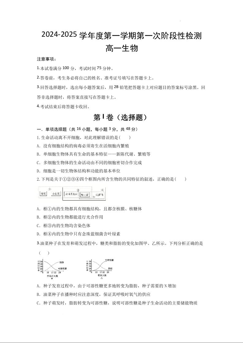 陕西省西安市部分学校联考2024-2025学年高一上学期10月月考生物+答案