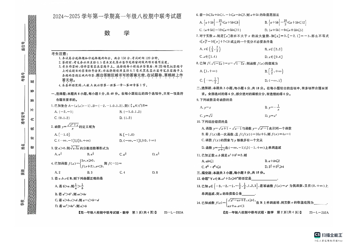 陕西省榆林市2024~2025学年第一学期高一年级八校期中联考试题数学+答案