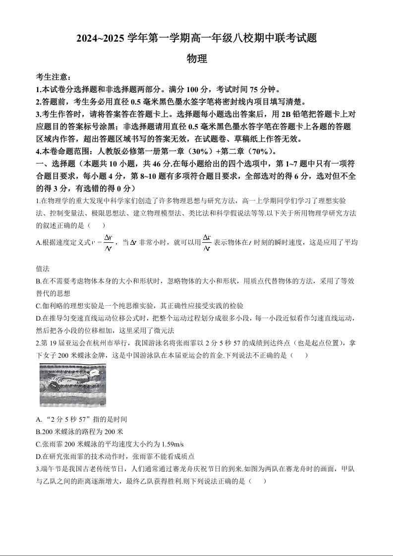 陕西省榆林市2024~2025学年第一学期高一年级八校期中联考试题物理+答案