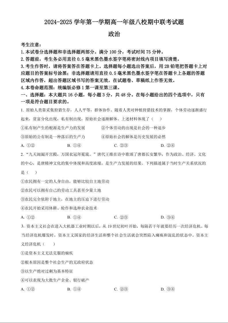 陕西省榆林市2024~2025学年第一学期高一年级八校期中联考试题政治+答案