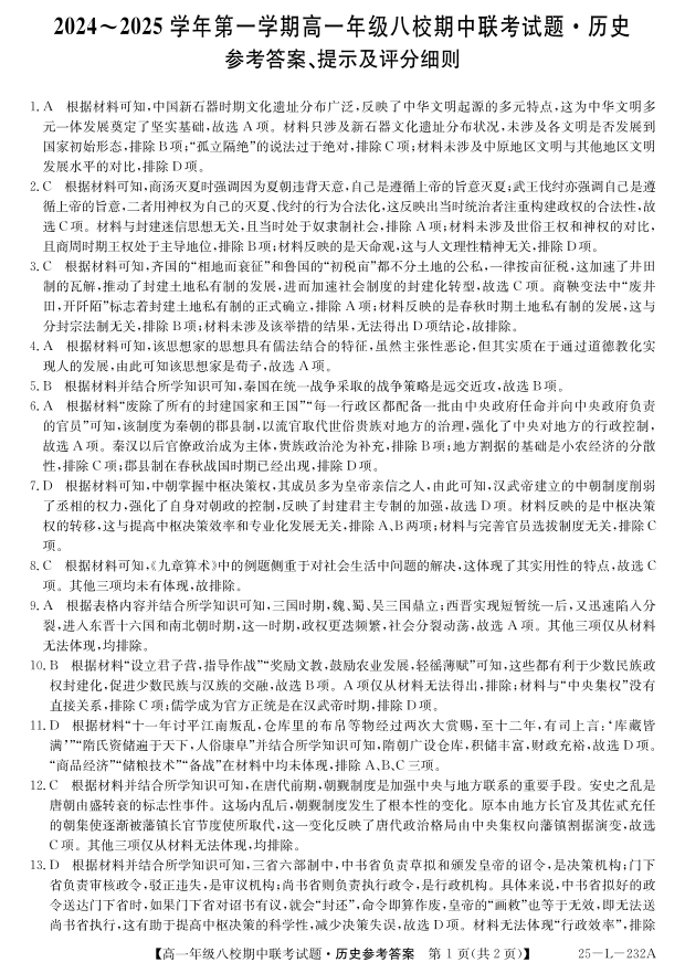 陕西省榆林市2024~2025学年第一学期高一年级八校期中联考试题历史答案