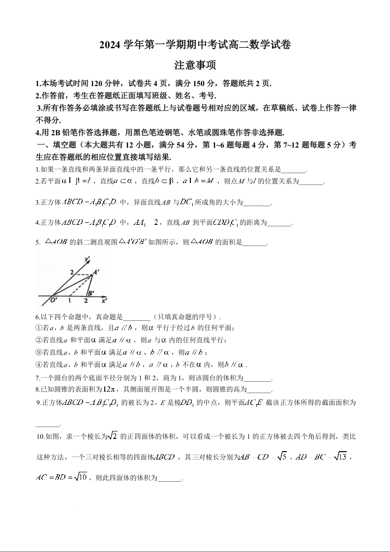 上海市闵行区六校联考2024学年第一学期期中考试高二数学