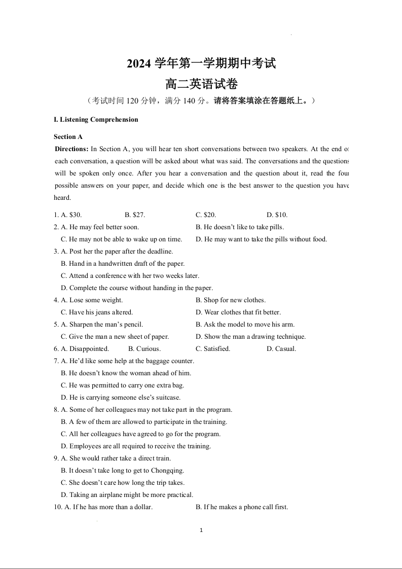 上海市闵行区六校联考2024学年第一学期期中考试高二英语