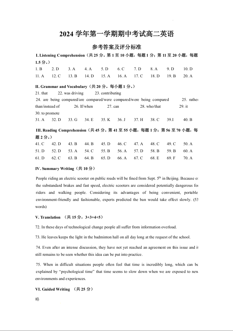 上海市闵行区六校联考2024学年第一学期期中考试高二英语答案