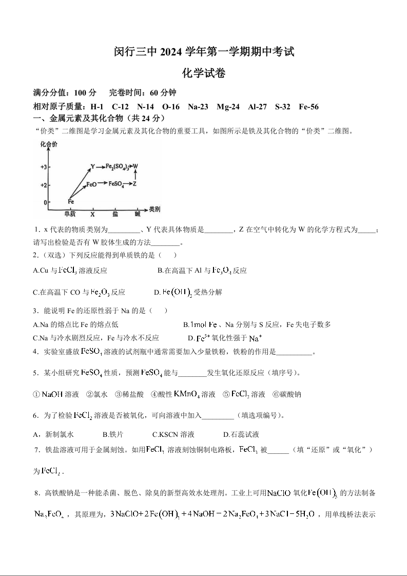 上海市闵行区六校联考2024学年第一学期期中考试高二化学