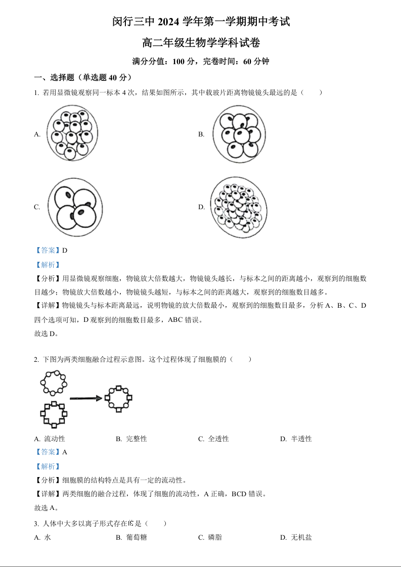 上海市闵行区六校联考2024学年第一学期期中考试高二生物(解析版)