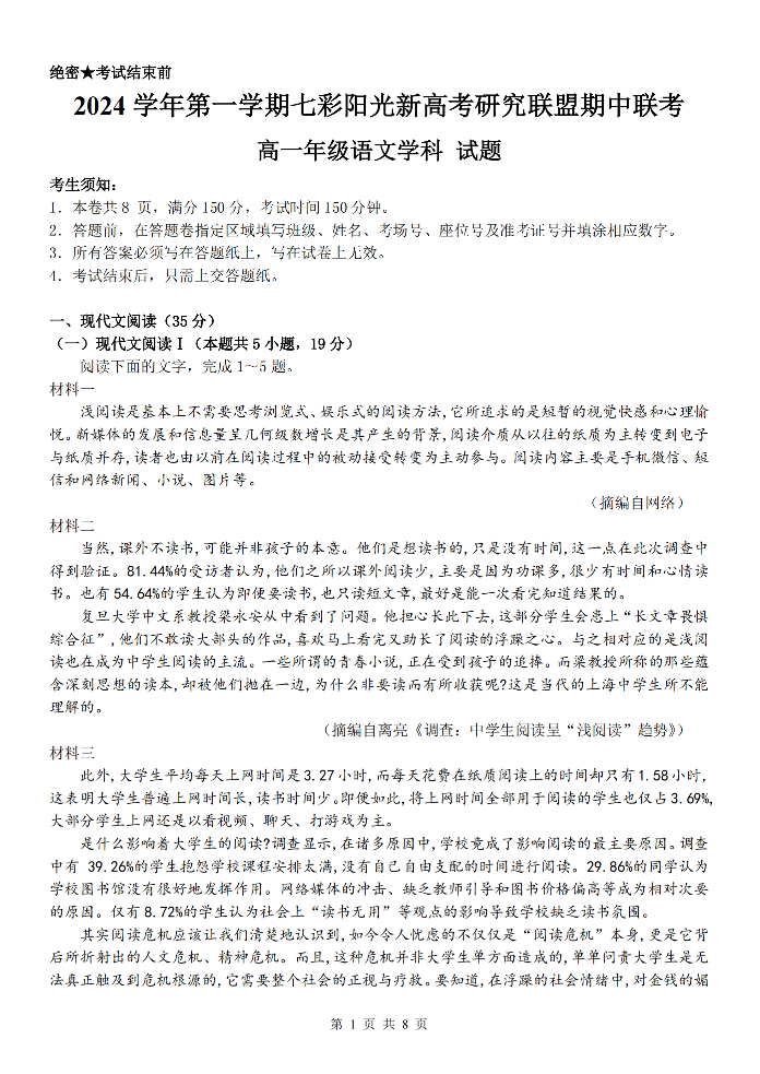 浙江2024学年第一学期浙江“七彩阳光”新高考研究联盟期中联考语文