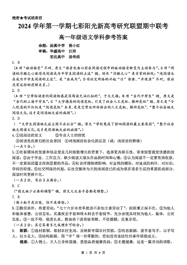 浙江2024学年第一学期浙江“七彩阳光”新高考研究联盟期中联考语文答案