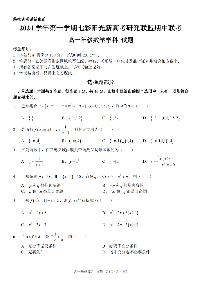 浙江2024学年第一学期浙江“七彩阳光”新高考研究联盟期中联考数学