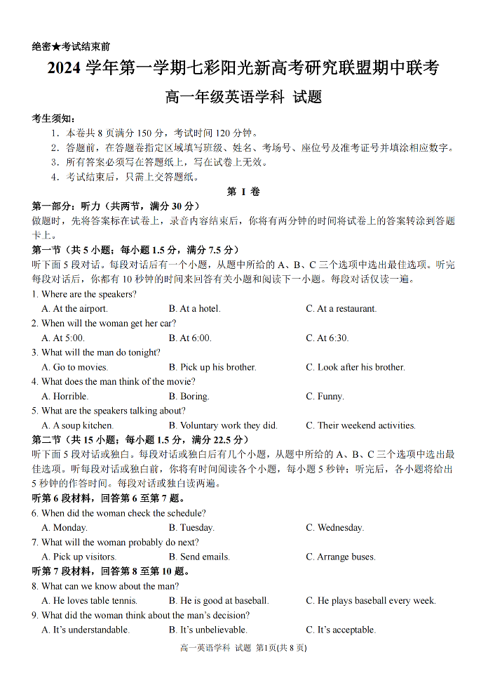 浙江2024学年第一学期浙江“七彩阳光”新高考研究联盟期中联考英语