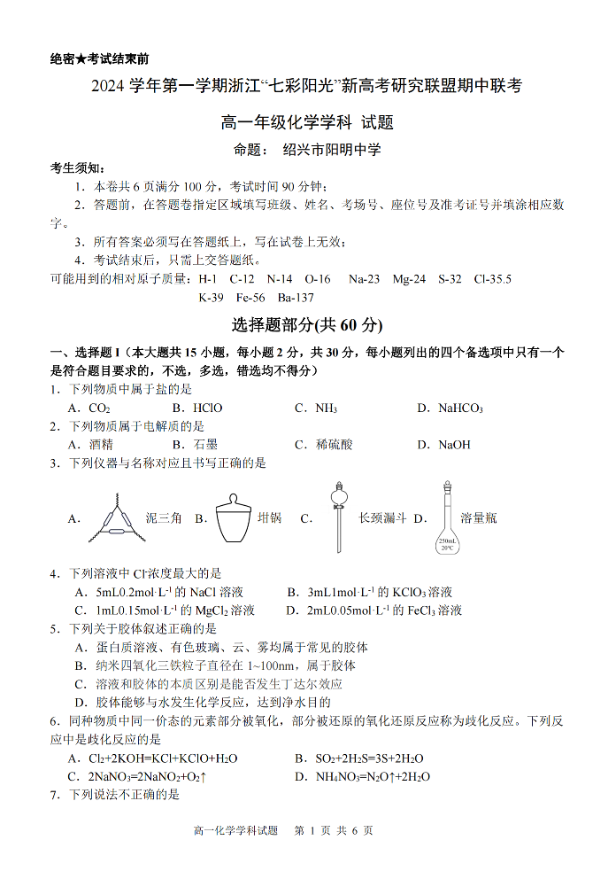 浙江2024学年第一学期浙江“七彩阳光”新高考研究联盟期中联考化学