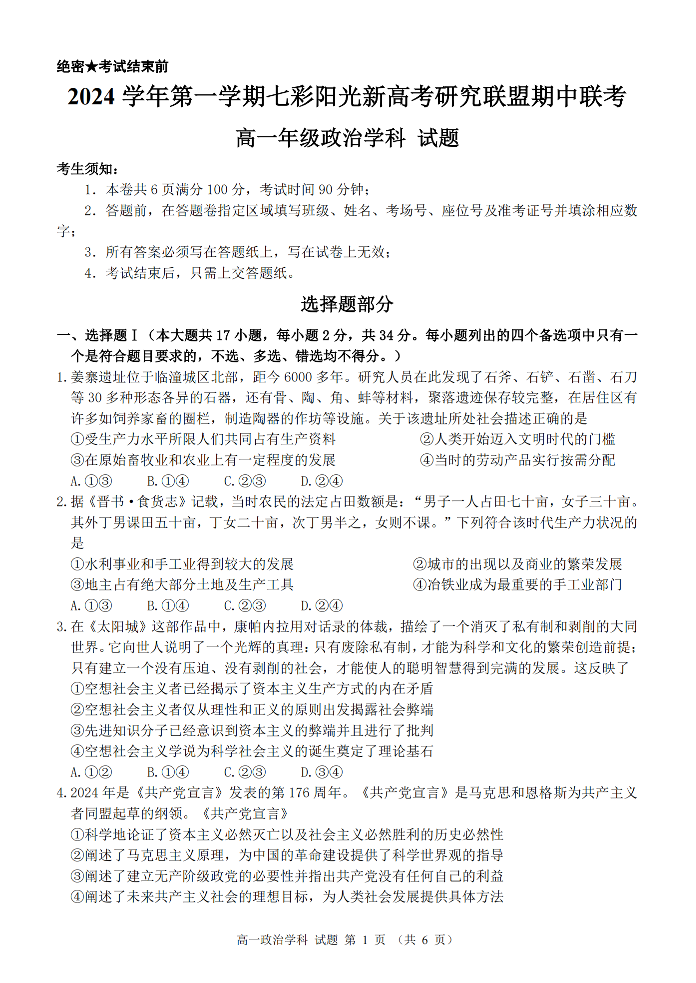 浙江2024学年第一学期浙江“七彩阳光”新高考研究联盟期中联考政治