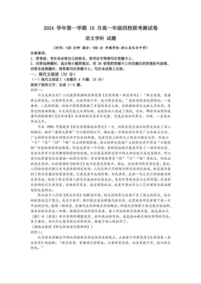 浙江省杭州市周边重点中学2024学年第一学期高一年级10月四校联考语文