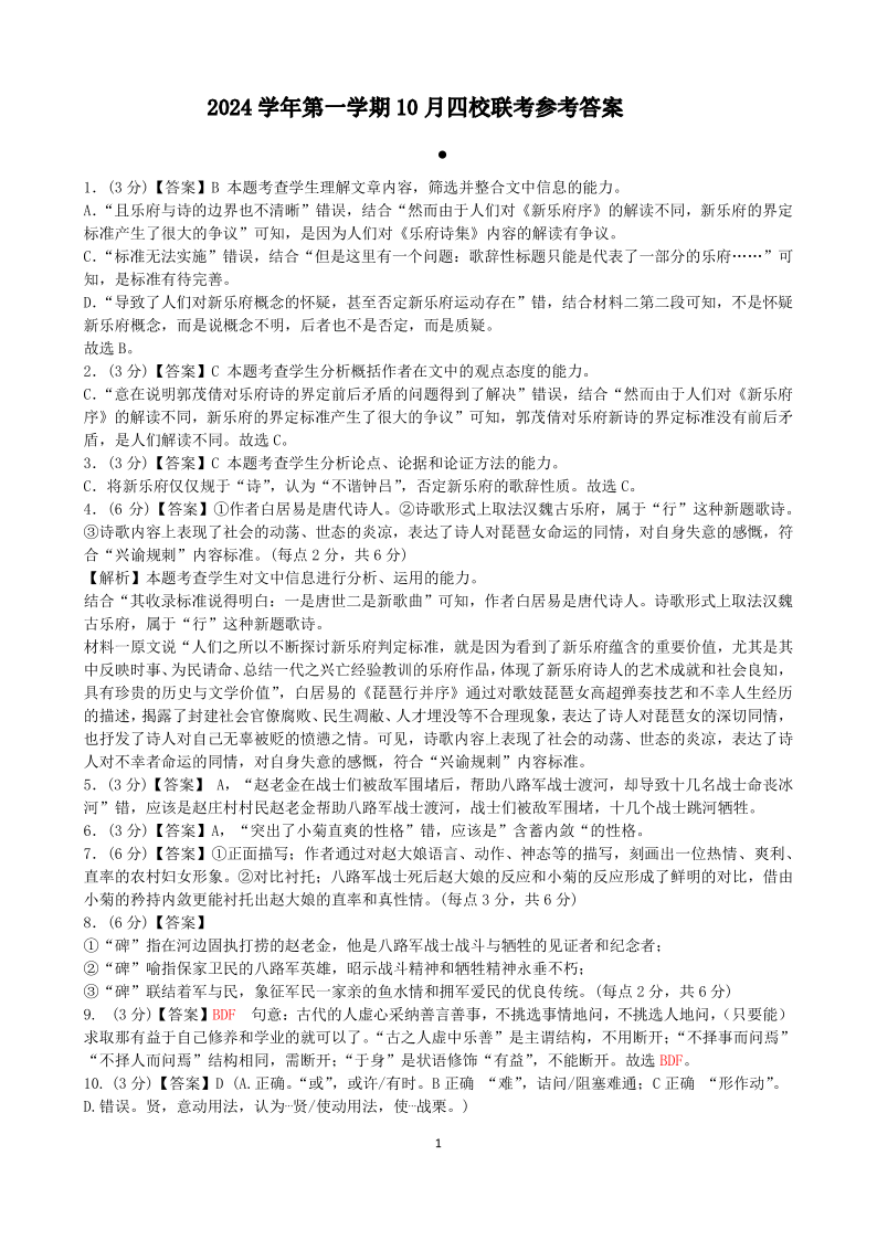 浙江省杭州市周边重点中学2024学年第一学期高一年级10月四校联考语文答案