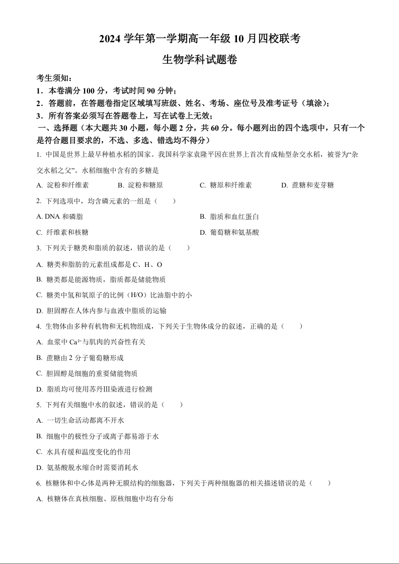 浙江省杭州市周边重点中学2024学年第一学期高一年级10月四校联考生物