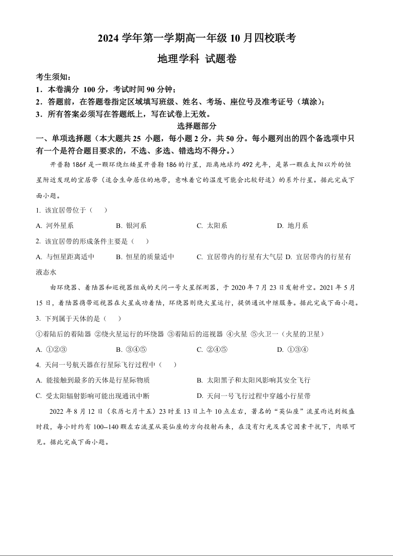 浙江省杭州市周边重点中学2024学年第一学期高一年级10月四校联考地理