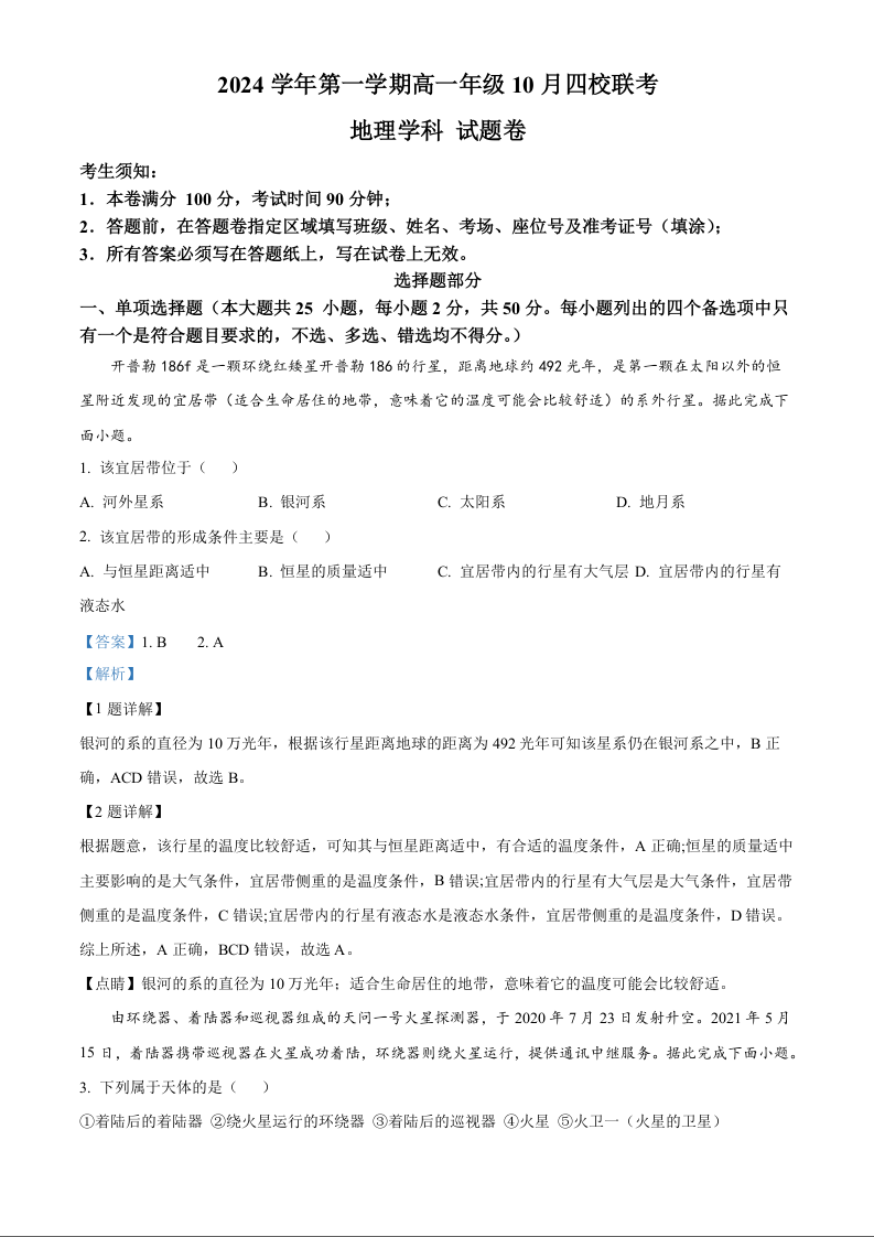 浙江省杭州市周边重点中学2024学年第一学期高一年级10月四校联考地理+答案
