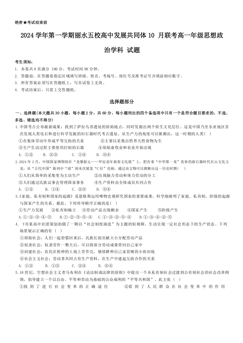 浙江省丽水市2024 学年第一学期丽水五校高中发展共同体 10 月联考政治