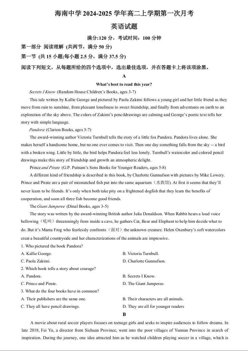 海南省海南中学2024-2025学年高二上学期第一次月考英语+答案