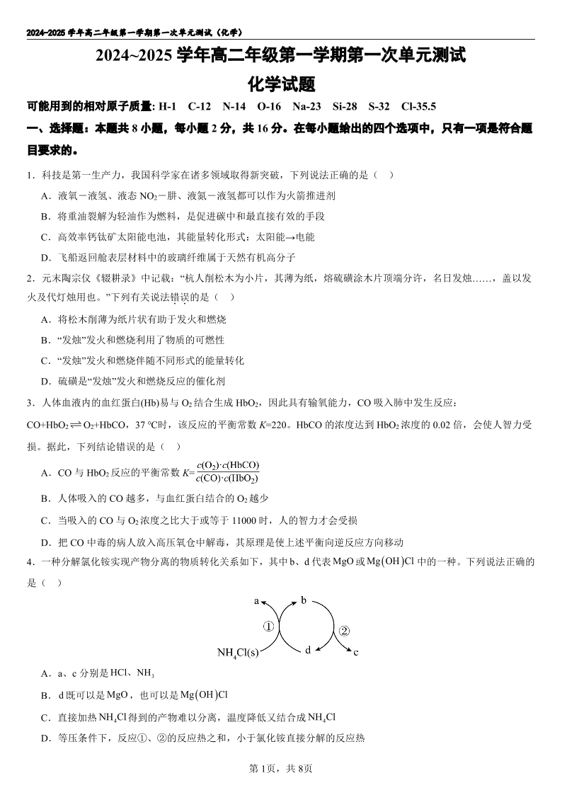 海南省海南中学2024-2025学年高二上学期第一次月考化学+答案