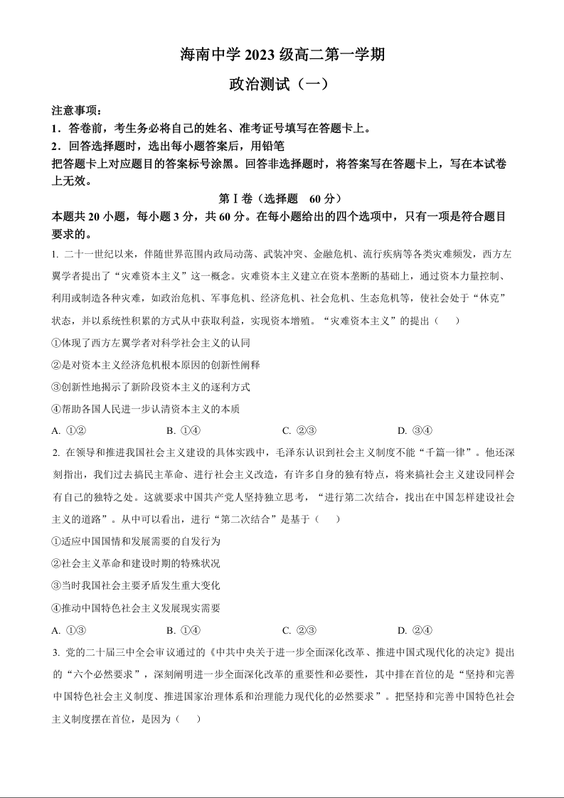 海南省海南中学2024-2025学年高二上学期第一次月考政治+答案