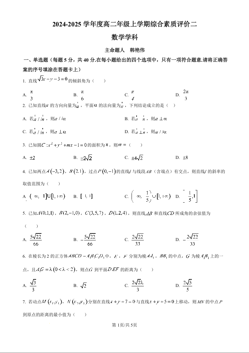 河北衡水中学2024-2025学年度高二年级上学期综合素养测评二数学(原卷版)