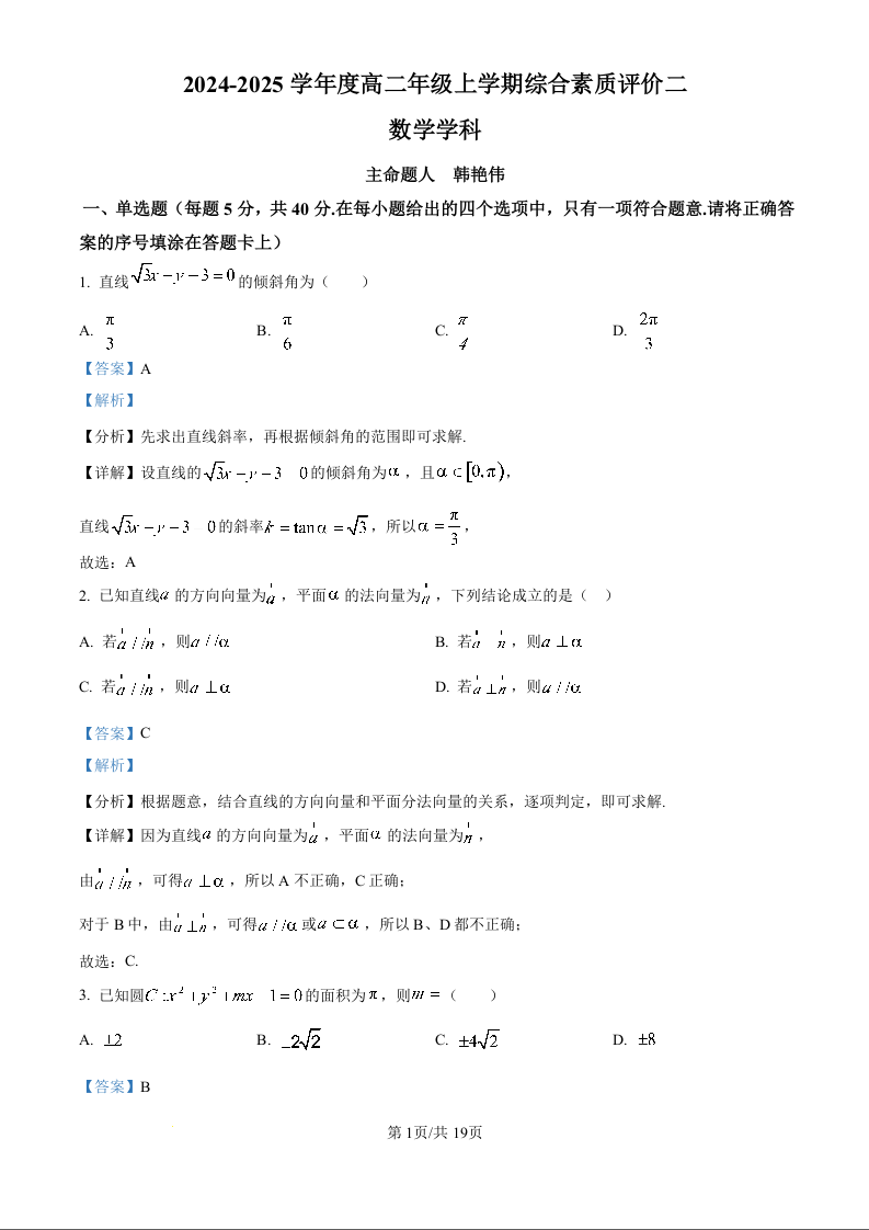 河北衡水中学2024-2025学年度高二年级上学期综合素养测评二数学(解析版)