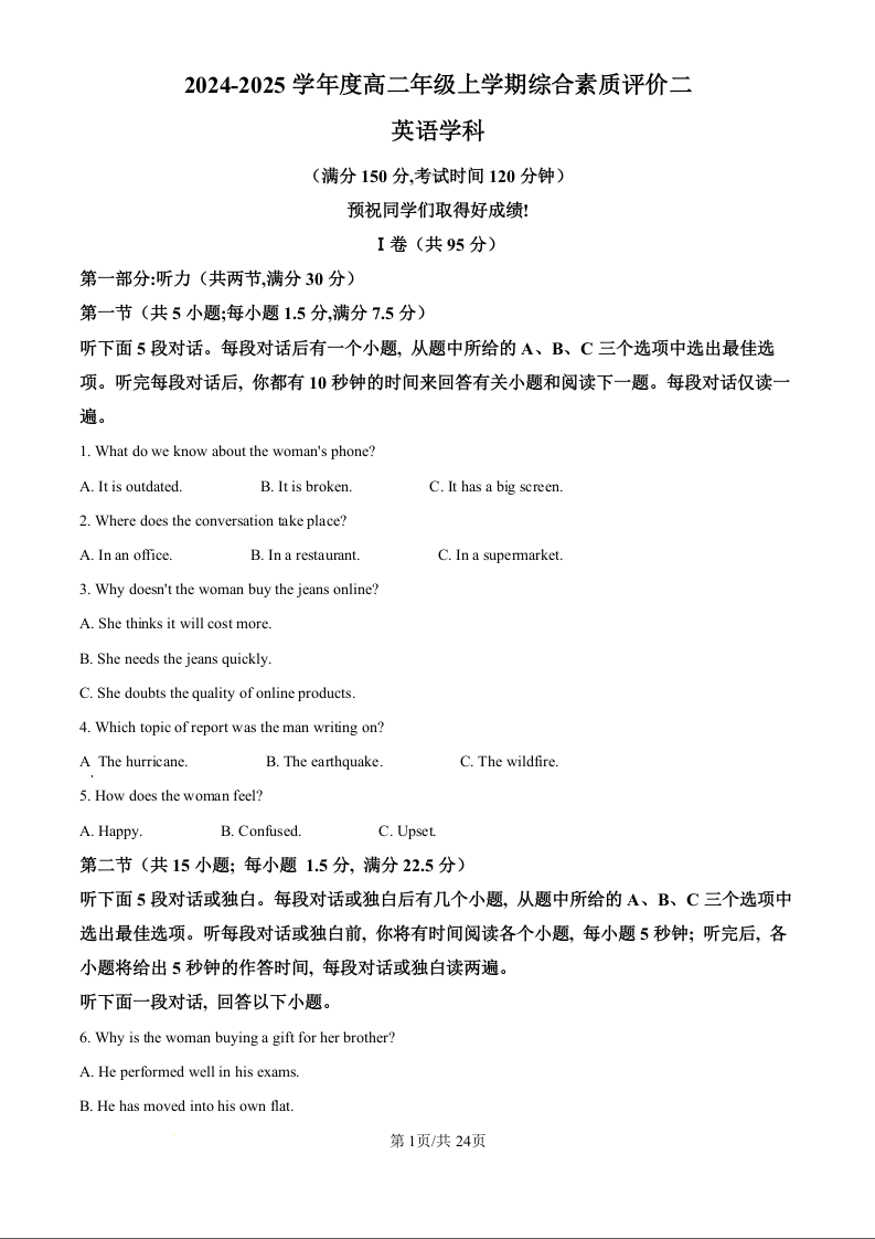 河北衡水中学2024-2025学年度高二年级上学期综合素养测评二英语(解析版)