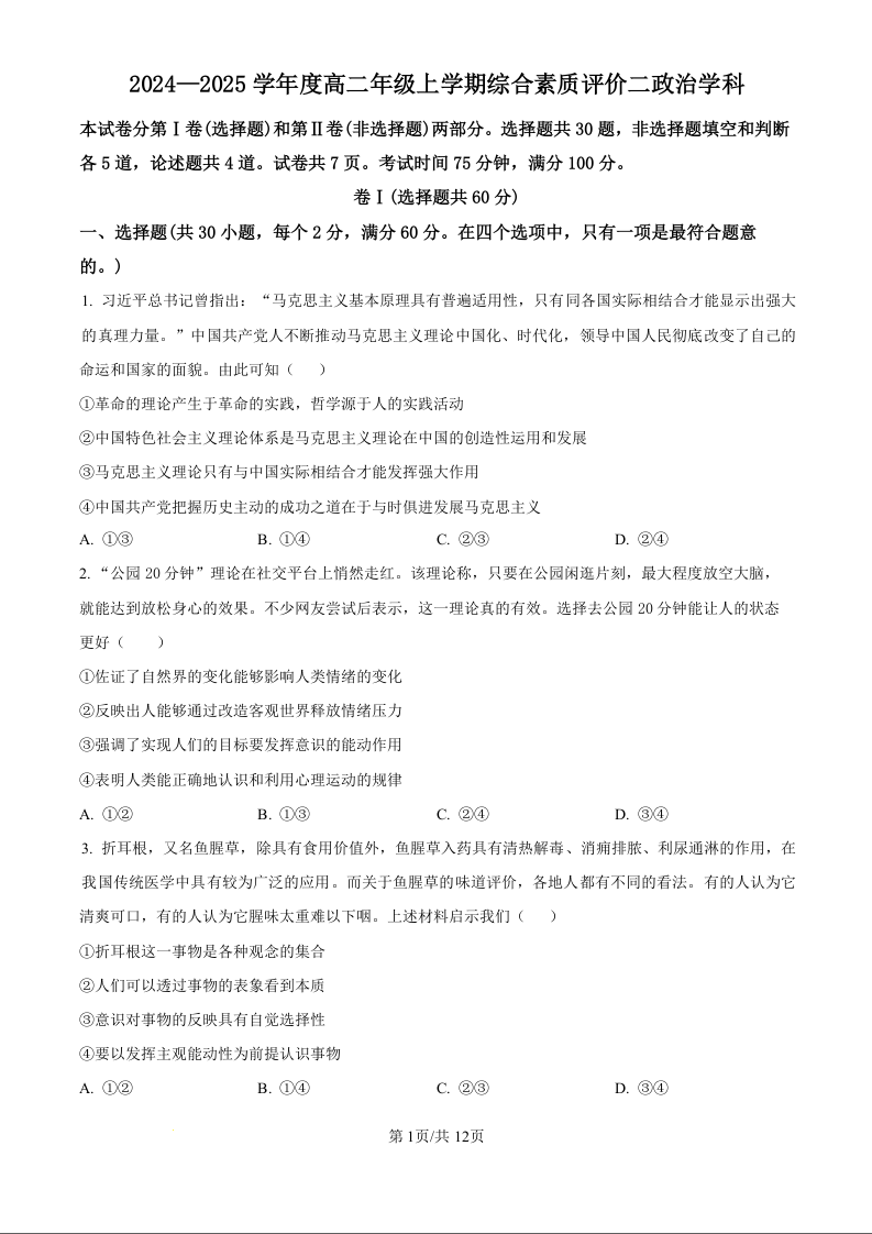 河北衡水中学2024-2025学年度高二年级上学期综合素养测评二政治(原卷版)