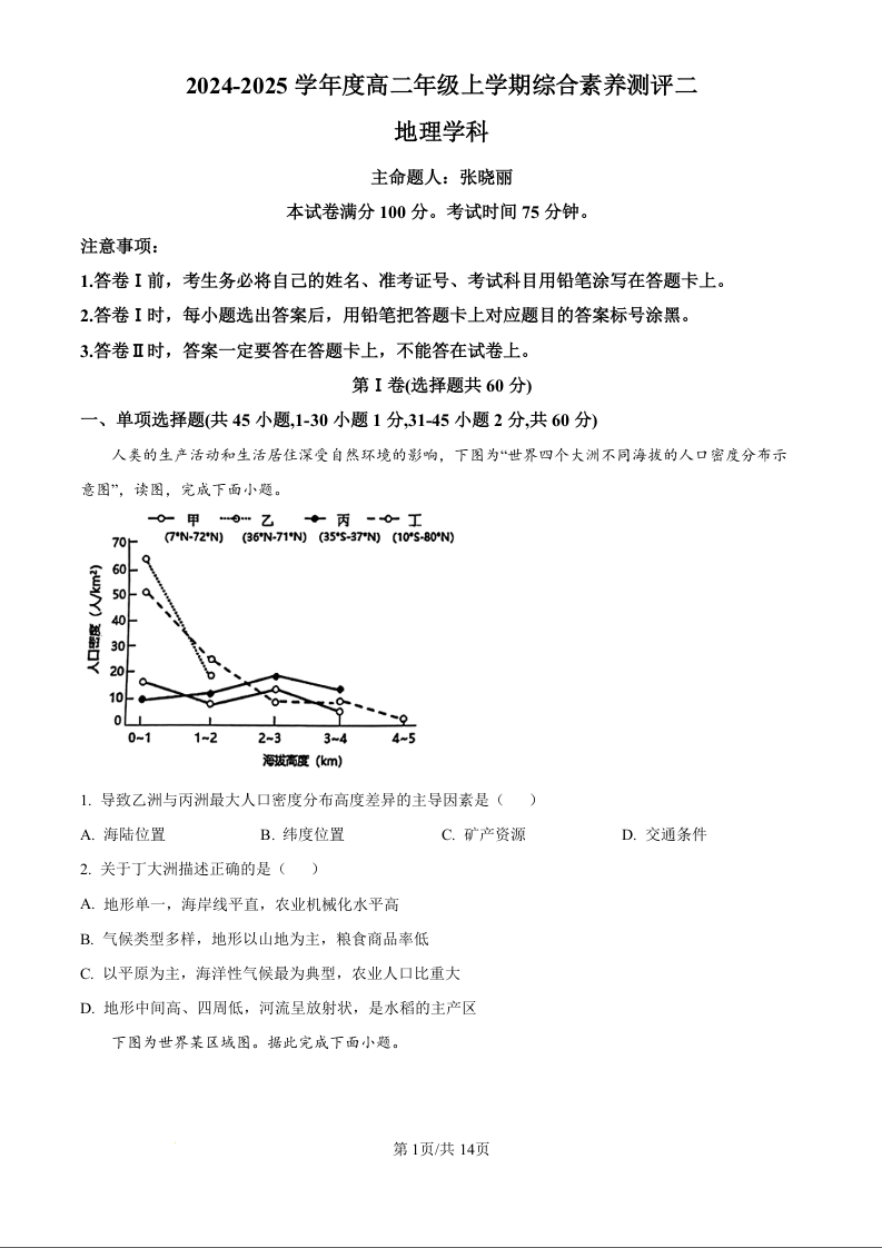 河北衡水中学2024-2025学年度高二年级上学期综合素养测评二地理(原卷版)