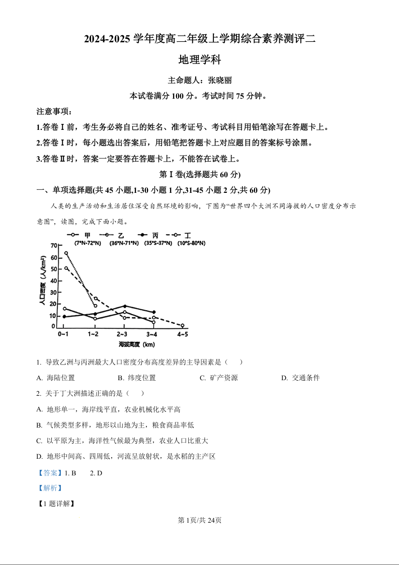 河北衡水中学2024-2025学年度高二年级上学期综合素养测评二地理(解析版)