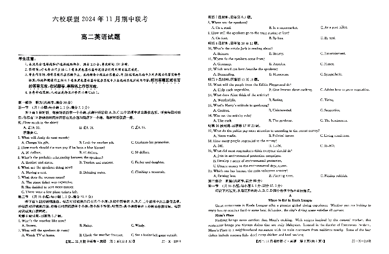 河北省保定市六校联盟2024年11月期中联考英语