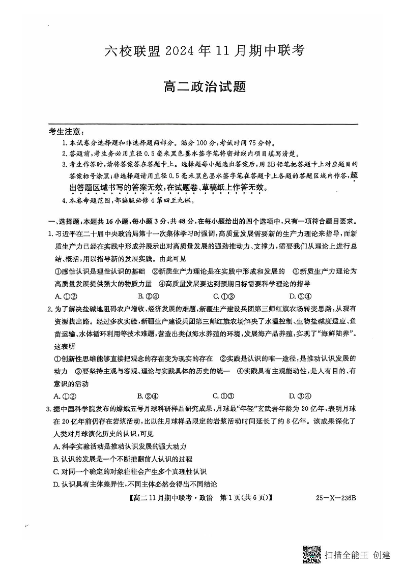 河北省保定市六校联盟2024年11月期中联考政治