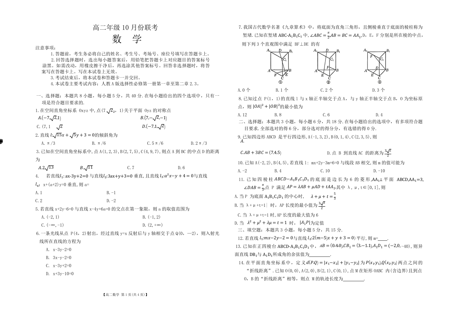 河北省部分学校2024-2025学年高二年级10月份联考数学